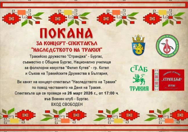 На 26 март 2026 г в Бургас ще се проведе празничен концерт-спектакъл „Наследството на Тракия“, посветен на Деня на Тракия.